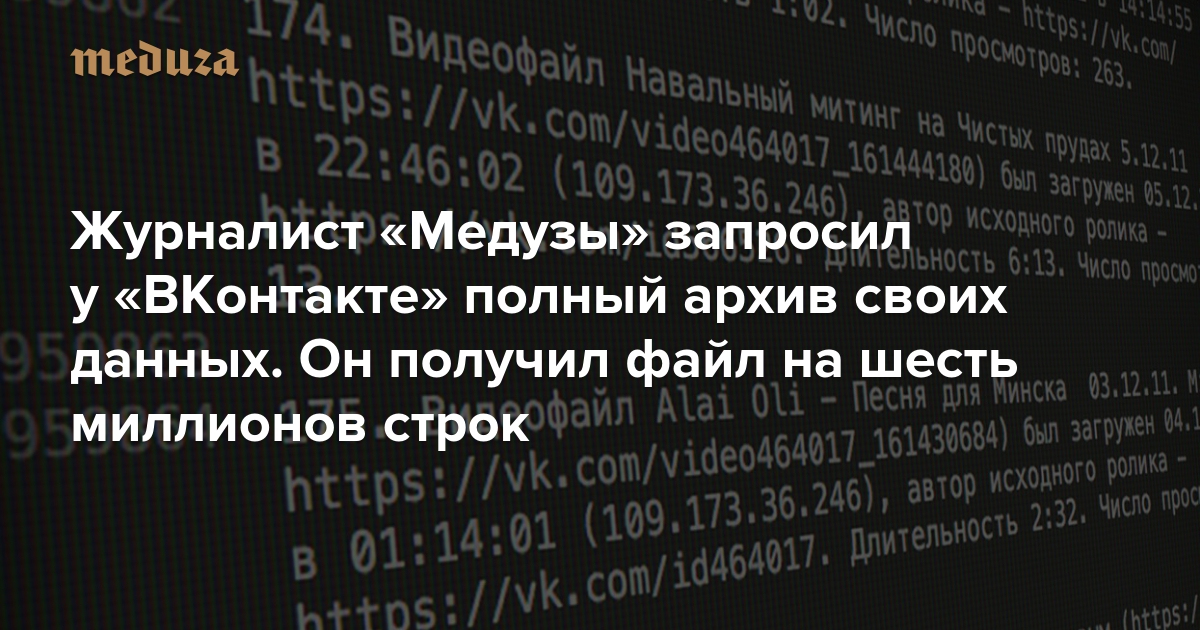 Журналист «Медузы» запросил у «ВКонтакте» полный архив своих данных. Он получил файл на шесть миллионов строк — и в нем не хватало инфор